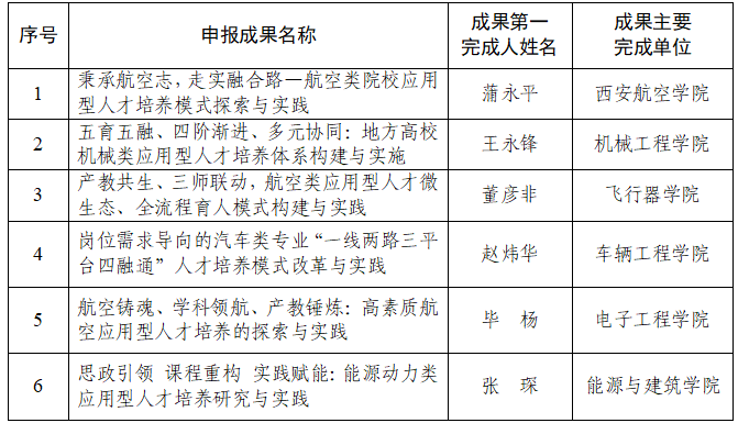 根据陕西省教育厅、陕西省人力资源和社会保障厅《关于开展2025年高等教育教学成果奖评审工作的通知》(陕教函〔2025〕688号)要求,学校开展了2025年度省级高等教学成果奖的申报和评审工作。经过专家评审、教学工作委员会审议,拟推荐“互溶、同频、共生:地方航空类院校应用型人才培养模式的探索与实践”等6项教学成果申报省级高等教学成果奖。现将评审结果予以公示: